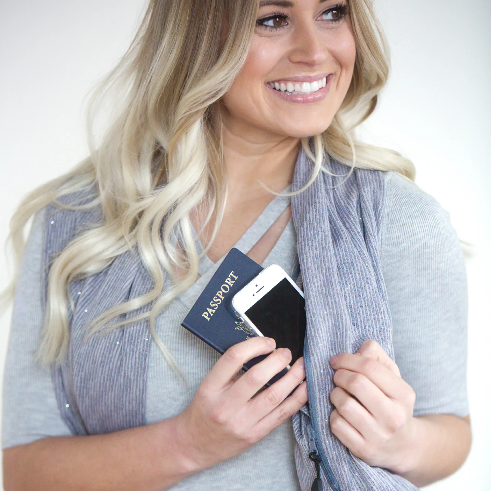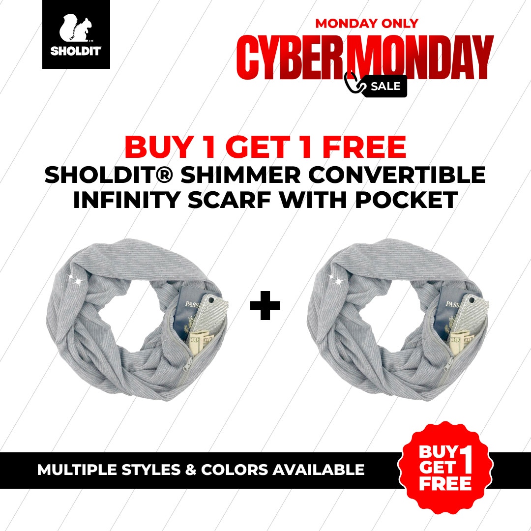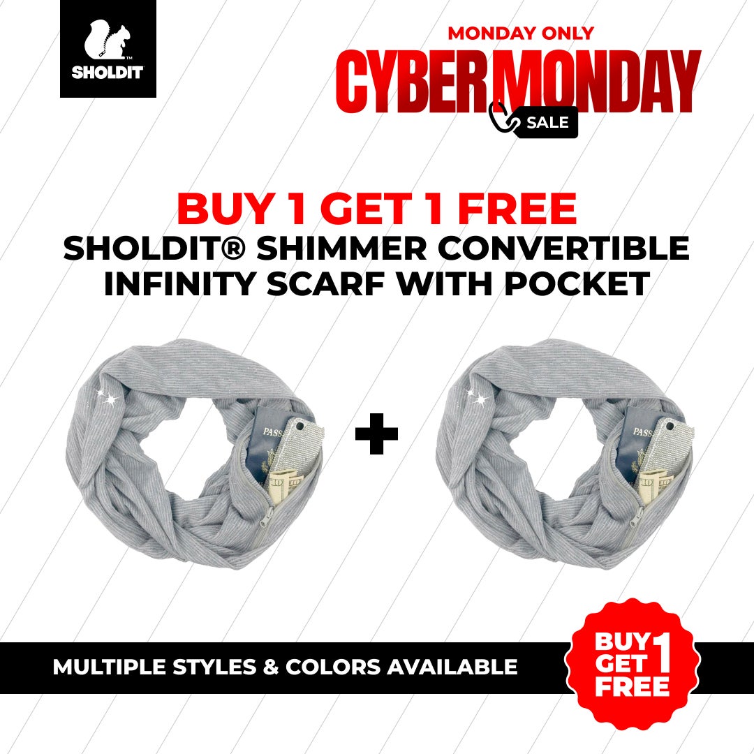 The SHOLDIT® Shimmer Infinity Scarf is crafted with a hidden pocket, so you can carry your phone, wallet, and keys hands-free while adding a sophisticated touch to your outfit.